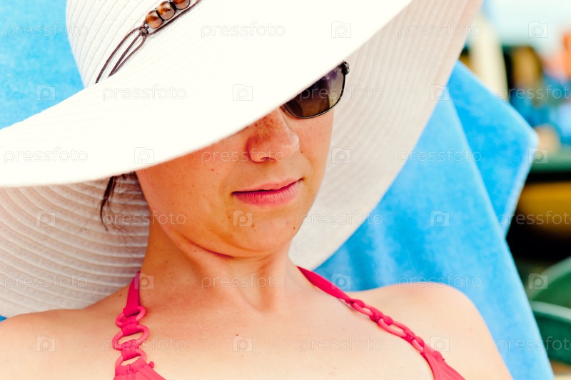 Портрет девушки в белой шляпе с широкими полями на пляже