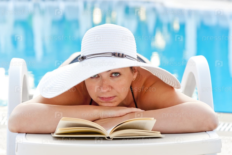 Красивая девушка в белой шляпе на шезлонге рядом с бассейном