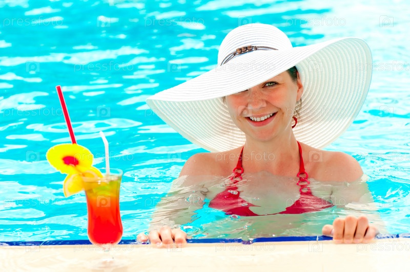 Молодая девушка в белой шляпе в бассейне