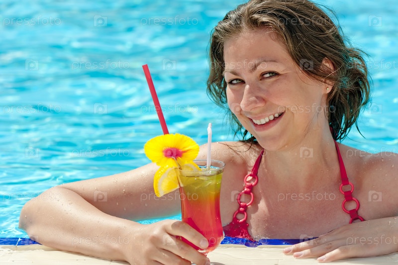 Очаровательная девушка в бассейне с коктейлем