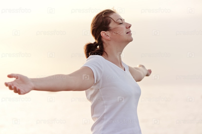 Молодая женщина наслаждается свободой с распростертыми объятиями