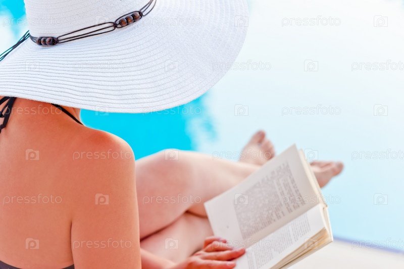 Девушка в шляпе читает книгу рядом с бассейном, сидя в шезлонге