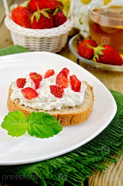Хлеб с творожным кремом и клубникой на доске