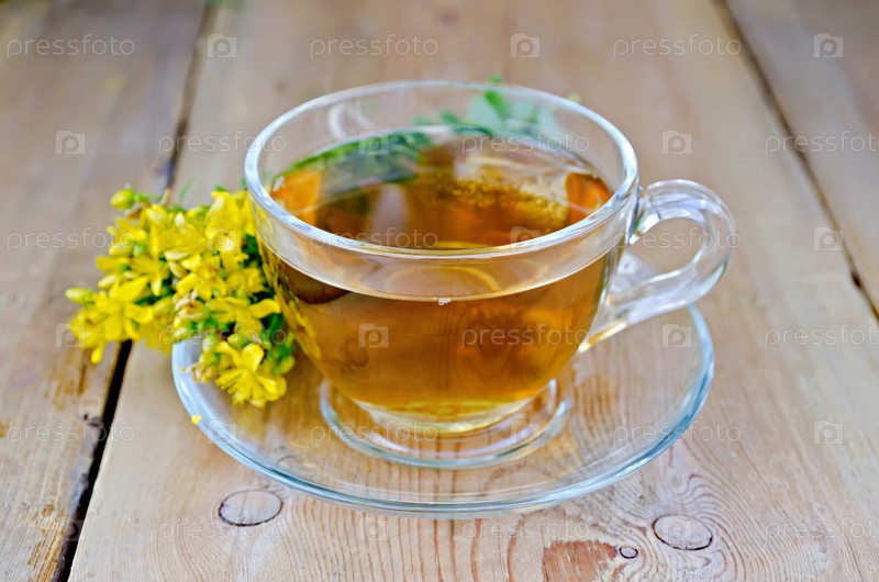 Травяной чай из зверобоя в стеклянной чашке на доске