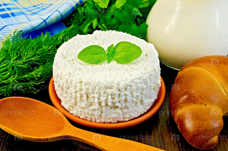 Творог с ложкой и рогаликом на доске