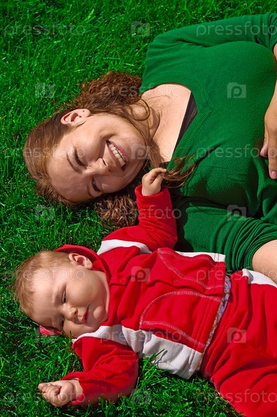 Женщина с ребенком лежат на зеленой траве
