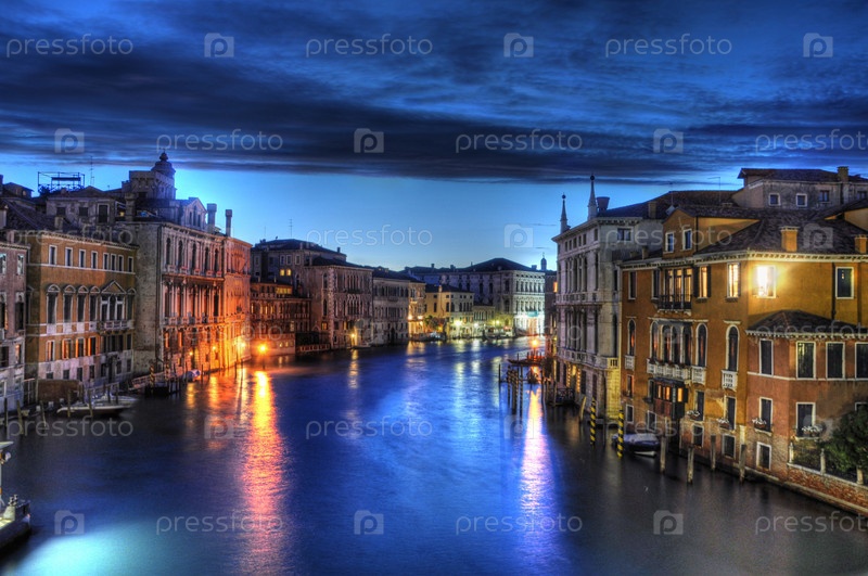 Ночной канал в Венеции с красивым освещением, Венеция, Италия
