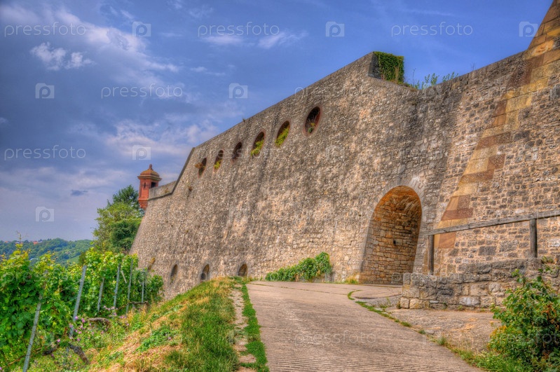 Каменные стены крепости Мариенберг, виноградник и Вюрцбург, Бавария, Германия