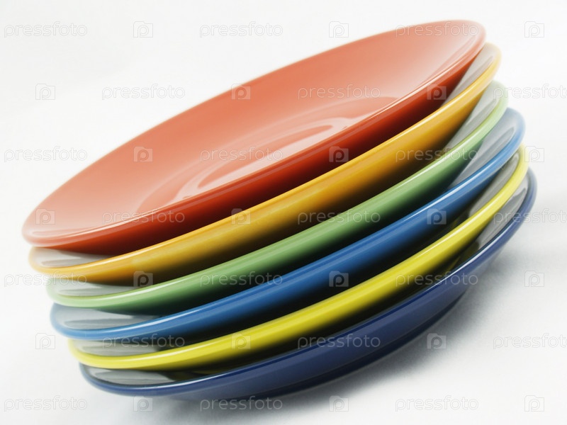 Коллекция разноцветных тарелок на белом фоне
