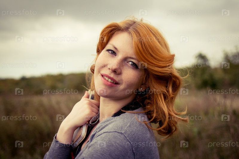 Портрет красивой рыжеволосой девушки в осеннем парке