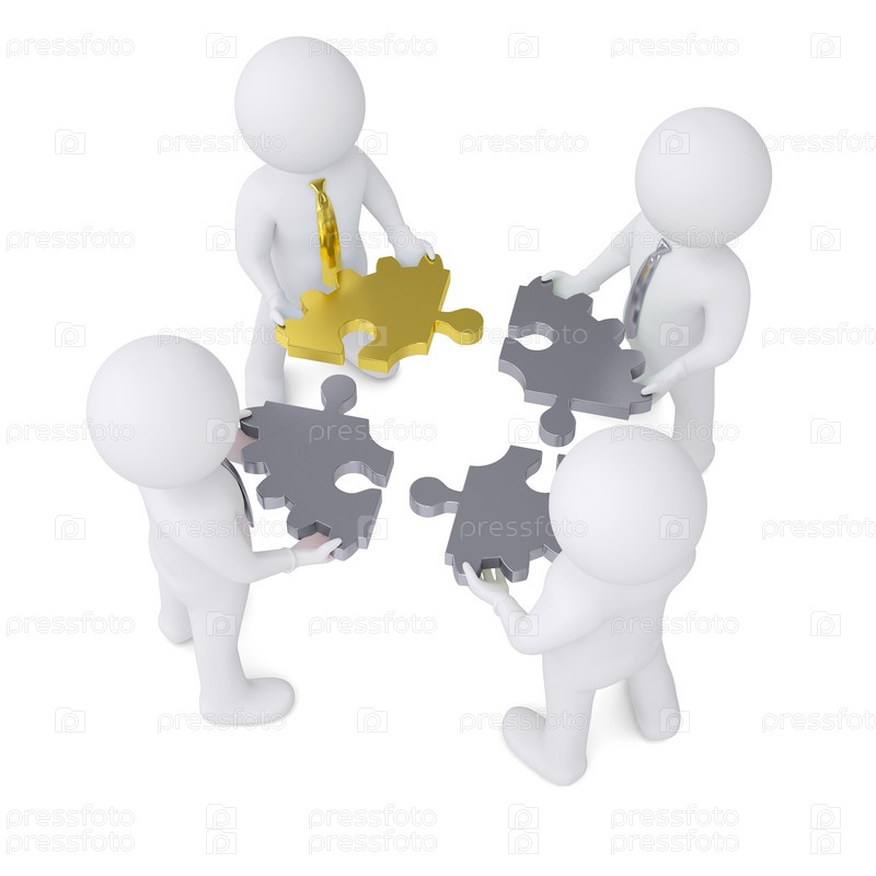 Четыре человека с деталью, состоящей из пазлов