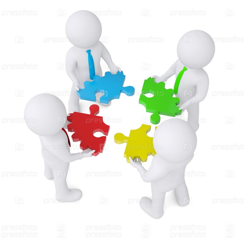Четыре человека с деталью, состоящей из пазлов