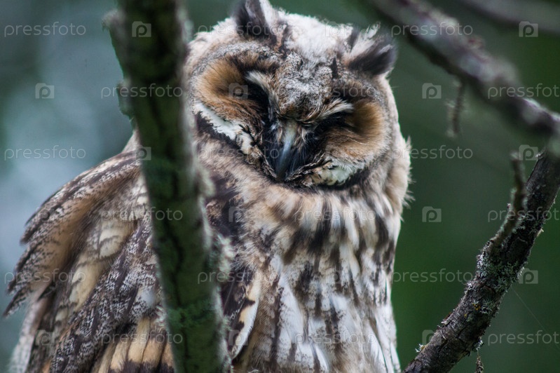 Рогатая сова сидит на ветке дерева