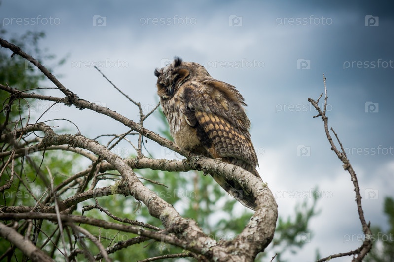 Рогатая сова сидит на ветке дерева