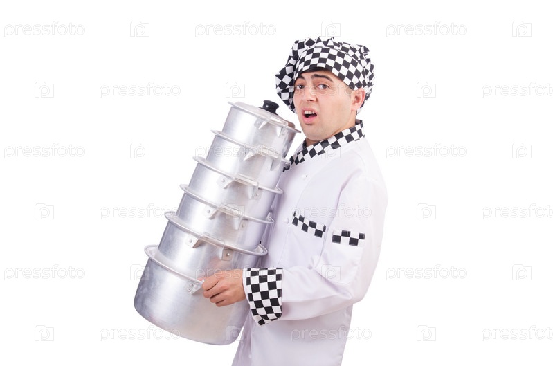Повар с кастрюлями на белом фоне