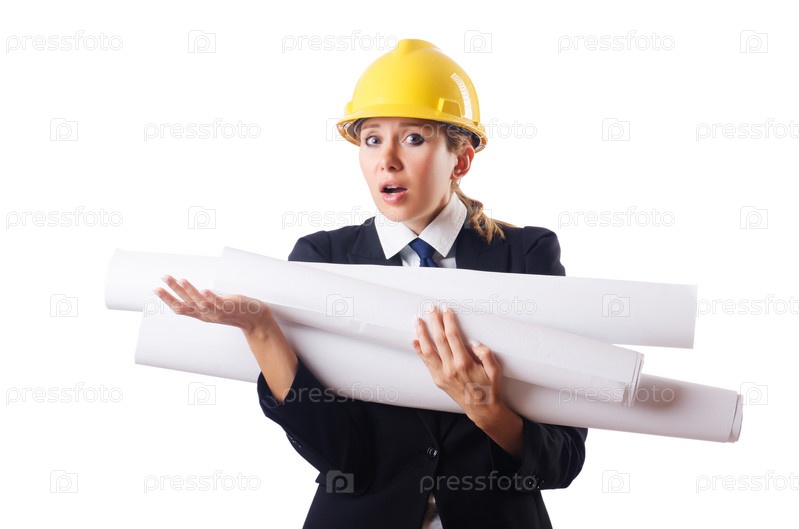 Женщина с чертежами, изолированная на белом фоне