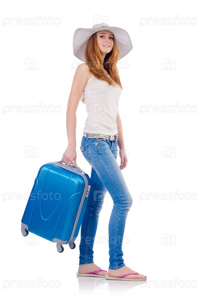 Девушка с чемоданами, изолированная на белом фоне