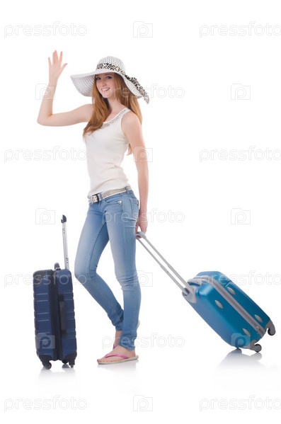 Девушка с чемоданами, изолированная на белом фоне