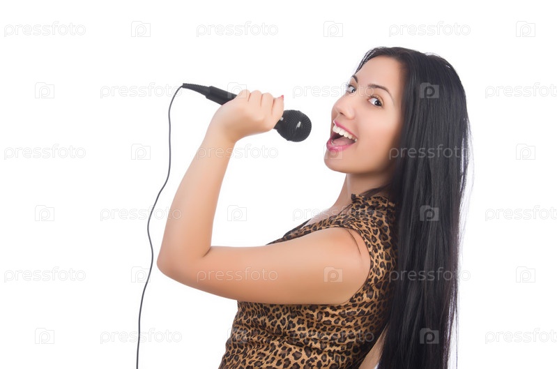 Певица с микрофоном на белом фоне