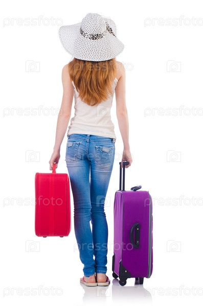 Девушка с чемоданами, изолированная на белом фоне