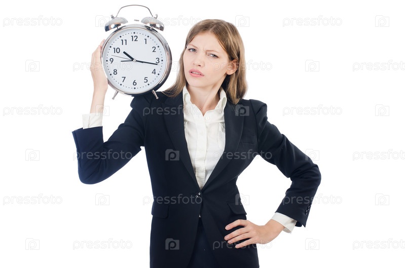 Бизнес-леди с часами, изолированная на белом фоне