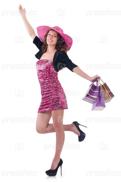 Девушка после удачного шопинга на белом фоне