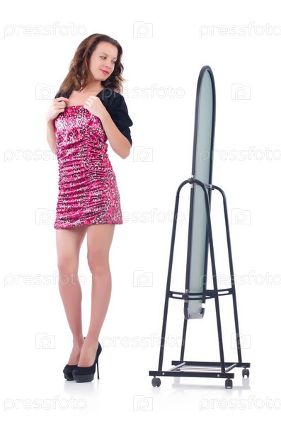 Женщина меряет новую одежду перед зеркалом
