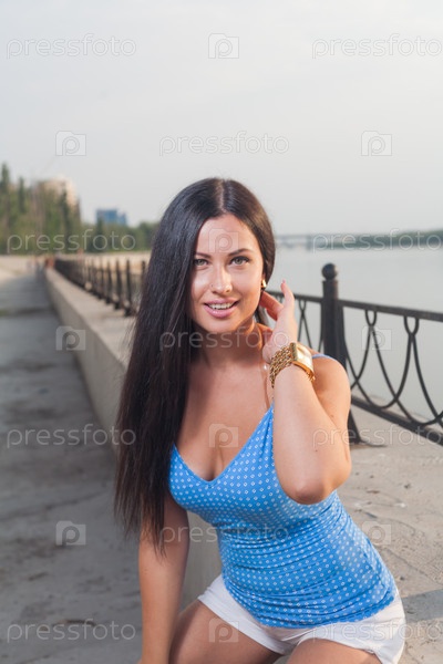Сексуальная длинноволосая брюнетка на набережной