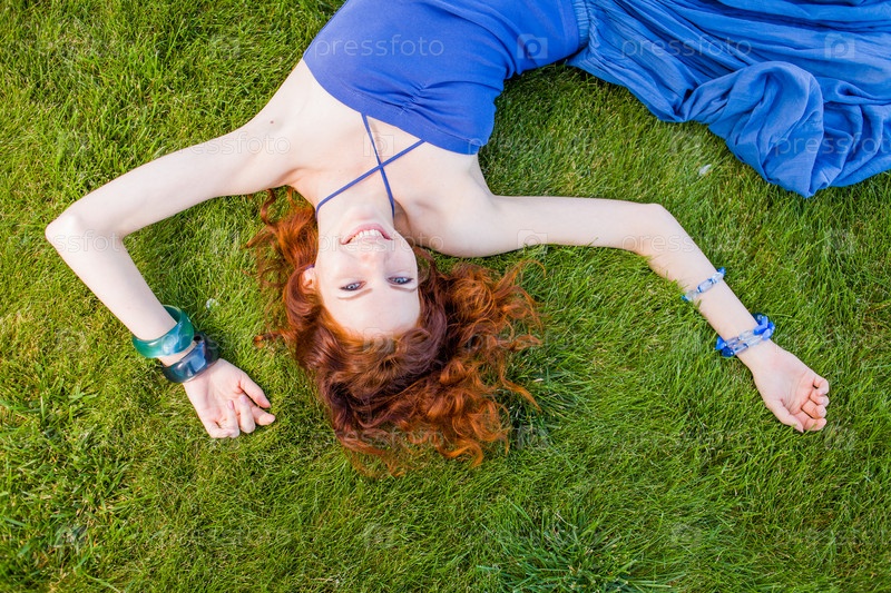 Рыжая женщина на зеленой траве