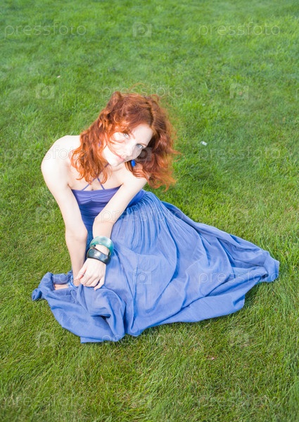 Рыжая женщина на свежей траве