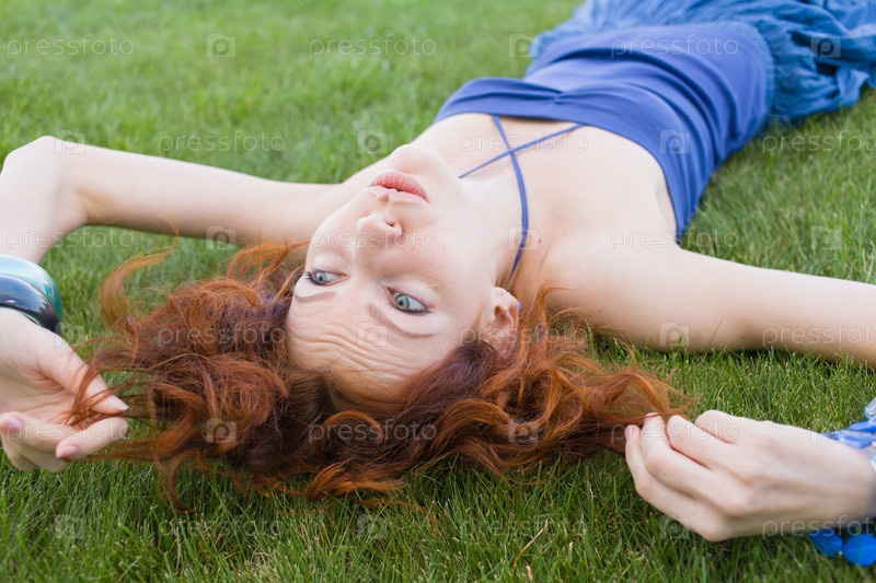 Рыжая женщина на зеленой траве
