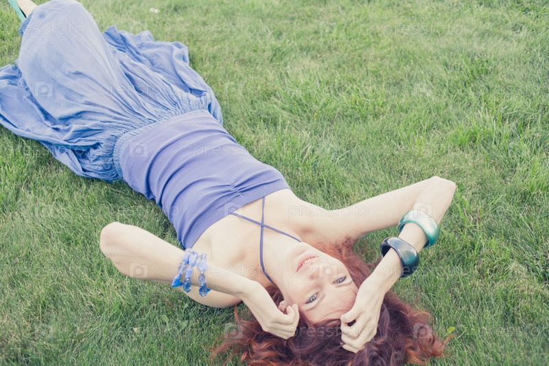 Рыжая женщина на зеленой траве