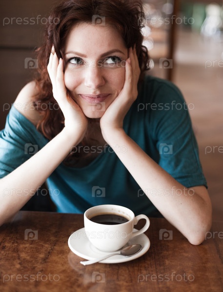 Рыжая женщина сидит в кафе с чашкой кофе