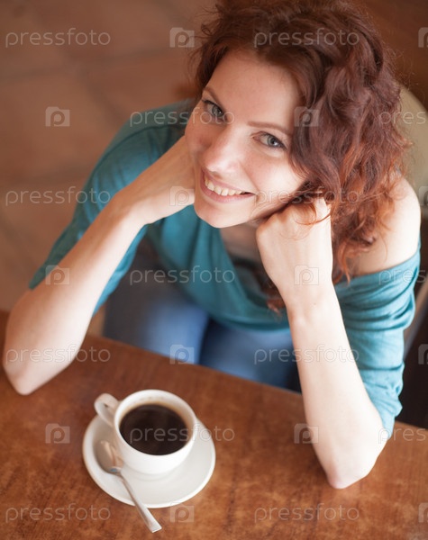 Рыжая женщина сидит в кафе с чашкой кофе