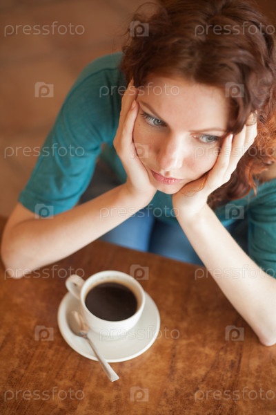 Рыжая женщина сидит в кафе с чашкой кофе
