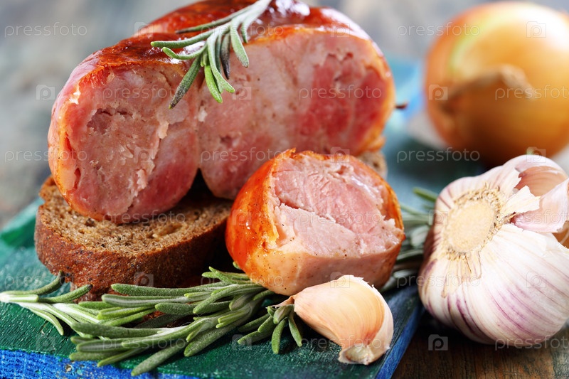 Домашняя колбаса, ржаной хлеб, чеснок и розмарин