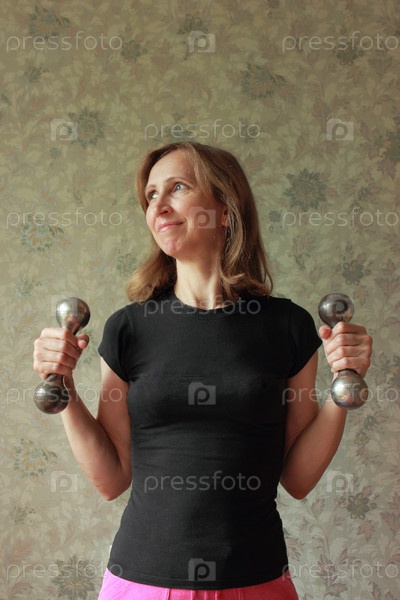 Женщина с гантелями занимается зарядкой