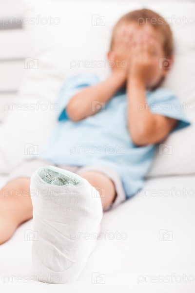 Мальчик с переломом пятки или ступни в гипсе