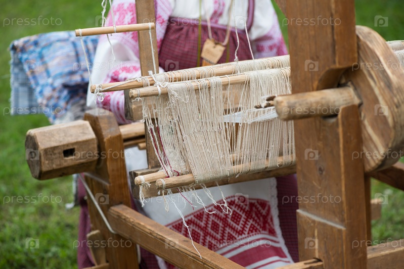 Неузнаваемая славянская женщина, работающая на старинном ткацком станке