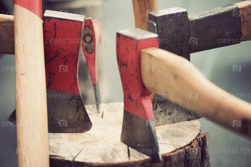 Несколько топоров в деревянном чурбане