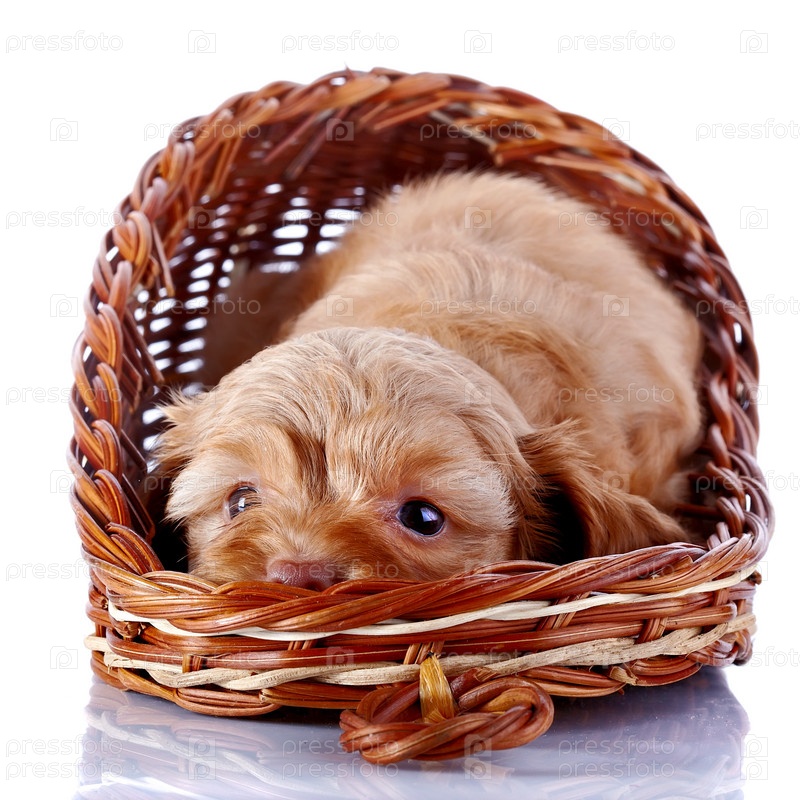 Красивый декоративный щенок в плетеной корзине