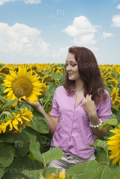 Красивая девушка в поле с подсолнухами