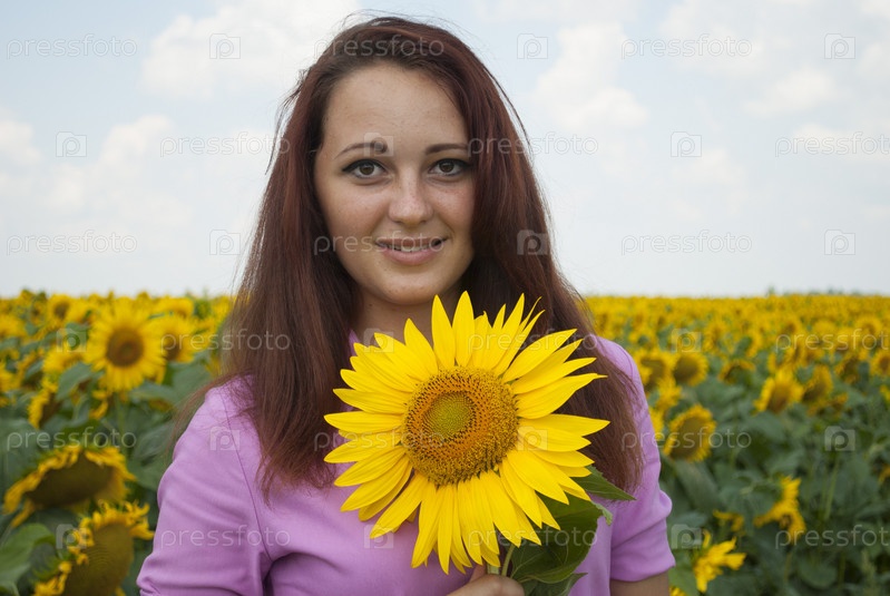 Красивая девушка в поле с подсолнухами