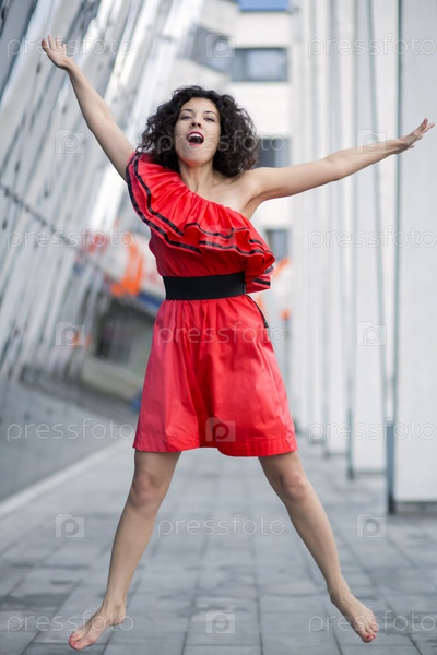 Женщина в красном платье прыгает