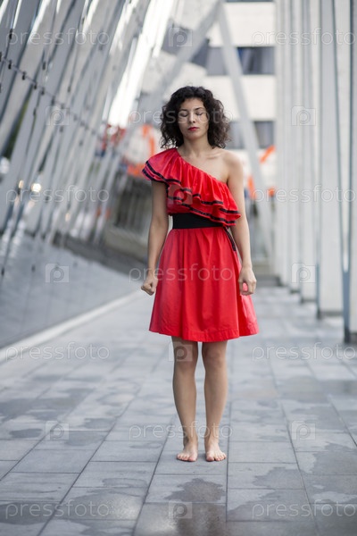 Женщина в красном платье стоит прямо