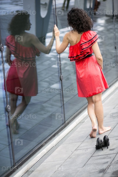 Женщина в красном платье идет вдоль стены