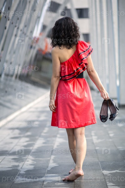 Женщина в красном платье разминает ноги