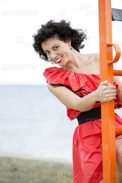 Женщина в красном платье поднимается по лестнице