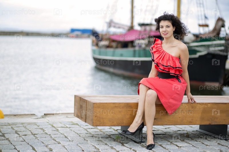 Женщина в красном платье позирует в гавани