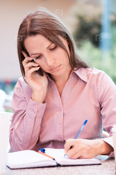 Бизнес-леди пишет в блокноте в кафе